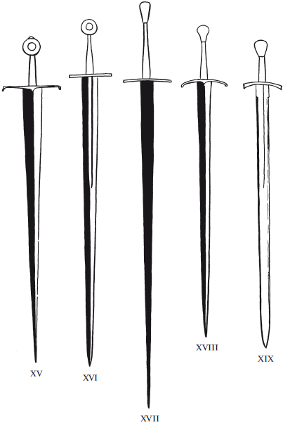 Таким образом, в два последних столетия Средних веков фактически появилось четыре основных типа мечей, хотя благодаря иллюстрациям создается впечатление, что их было великое множество; возможно, это связано с появлением новых стилей исполнения навершия и крестовины и множества декоративных элементов, добавленных как к новым, так и к старинным изделиям. В XV в. рукояти мечей начали снабжать дополнительными гардами; в последней его четверти и до конца XVI в. у многих клинков из Испании и Италии (где эти дополнения были наиболее популярны) рукояти уже были слишком сложны в исполнении. Этот момент мы рассмотрим отдельно позже.