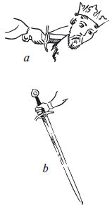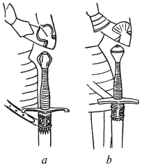 В то же время (начало XV в.), когда появилось простое одинарное кольцо для указательного пальца, иногда к боковой части крестовины прикрепляли еще одну, большую по размеру гарду в форме дуги для того, чтобы защитить заднюю часть руки. Примеры такого изделия можно увидеть на иллюстрациях в некоторых манускриптах того же времени, хотя только в немногих случаях мы можем с уверенностью сказать, что художник хотел изобразить именно такую гарду, поскольку положение с боковой стороны меча не позволяло нарисовать ее в двух измерениях. В качестве одного из примеров можно привести рисунок из испанской рукописи, датированной то ли 1422 г., то ли 1433 г. (рис. 169, а), другой – это иллюстрация из Богемской Библии, написанной около 1405 г. (рис. 169, b). Такие мечи есть и в гораздо более ранних манускриптах, к примеру в «Романсе Александра» из библиотеки Оксфорда (приблизительно 1330 г.), где изображено нечто, весьма похожее на боковую гарду в форме угла; сомнительно, что художник хотел просто нарисовать кожаную «chappe». Затем, в «Романсе Ланселота Озерного» (начало XIV в.) мы видим тот же самый предмет на рис. 85. В еще более раннем испанском манускрипте, принадлежащем перу Альфонсо де Визе (приблизительно 1275 г.), есть меч с утолщением в средней части крестовины, в некоторой степени прикрывающим заднюю часть руки. Это тот случай, когда трудно сказать наверняка – единичное ли это кольцо или ошибка художника. В данном случае я считаю, что все нарисовано совершенно верно – во-первых, в средневековый период стандарты искусства были очень высоки и лучшие художники были не более склонны создавать работы с ошибками, чем их современные последователи (а может быть, и меньше). Во-вторых, с каждой стороны утолщения наложены густые тени, а в середине виден отсвет. Литературные свидетельства также во многих случаях указывают на то, что этот вид гарды использовали начиная с XIV в. и далее.