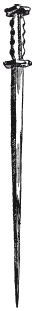 Кинжал, который очень часто использовали в Англии второй половины XIV в., был снабжен коротким лезвием, обычно с двухсторонней заточкой, уплощенного четырехстороннего сечения, с рукоятью как у маленького меча. Большинство наверший принадлежали либо к типу I, либо к типу J, крестовины в основном встречаются короткие и толстые. Один из них, очень хорошо сохранившийся, находится в Копенгагене, в коллекции мистера Кристенсена; его отличие заключается в длинной, тонкой, изогнутой крестовине стиля 7 и короткой рукояти, на которой сохранилась обтяжка; на ней борозды для пальцев, такие же как и на римских мечах.