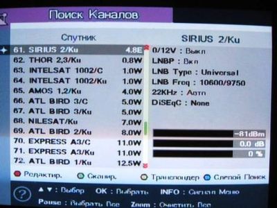 Включаю телевизор, ресивер, захожу в меню Установка-Поиск каналов. В списке спутников слева выбираю Sirius 2/Ku 4.8E-именно на этот спутник будет настроен жестко закрепленный центральный конвертор. Справа в меню выбираю: