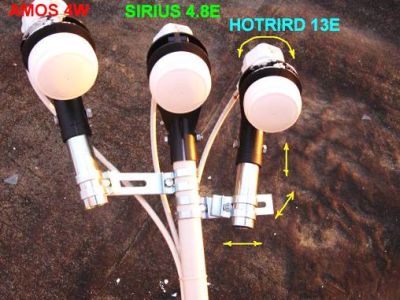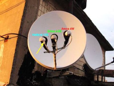Кстати, на вышеприведенном фото видны расстояния между конверторами и углами их наклона. Справа-антенна, направленная на Eutelsat W4.