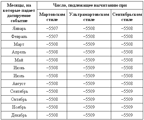 Так что, как видим, даже пользуясь одной и той же эрой, для пересчета дат с Сотворения Мира на Рождество Христово для разных месяцев необходимо вычитать разное число лет. Если мы имеем дело с мартовским годом по Византийской эре, начало которого следует за январским, то с марта по декабрь нужно вычитать 5508, а в январе-феврале — 5507. Если начало года предшествует январскому (такой год называется ультрамартовским), то март-декабрь — 5509, а январь-февраль — 5508.