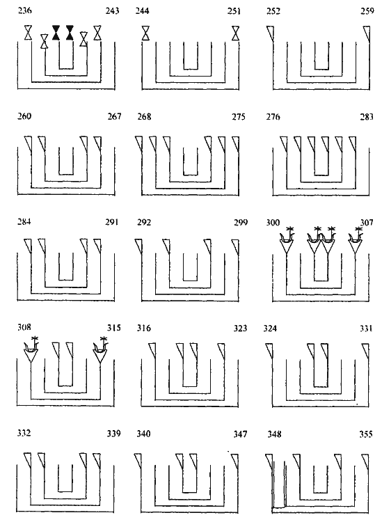 Но самое интересное описание попалось мне в руки уже в то время, когда я писал книгу. Вышел в свет сборник «Летописи и хроники» за 2008 г. Слава богу, что публикация этого издания возобновилась после 25 лет паузы. Потому что в нем я нашел статью Т. В. Анисимовой «Сборник хронографический с Рогожским летописцем (археографическое описание)» {14} , в которой автор не только подробнейшим образом излагает, на какой странице какая часть сборника размещена, на какой бумаге написана и каким почерком, но и приводит стемму тетрадей, с распределением в них филиграней.