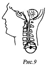 Топография: точка расположена между трапециевидными мышцами, где расположены разветвления затылочной артерии, третий шейный нерв и большой затылочный нерв.