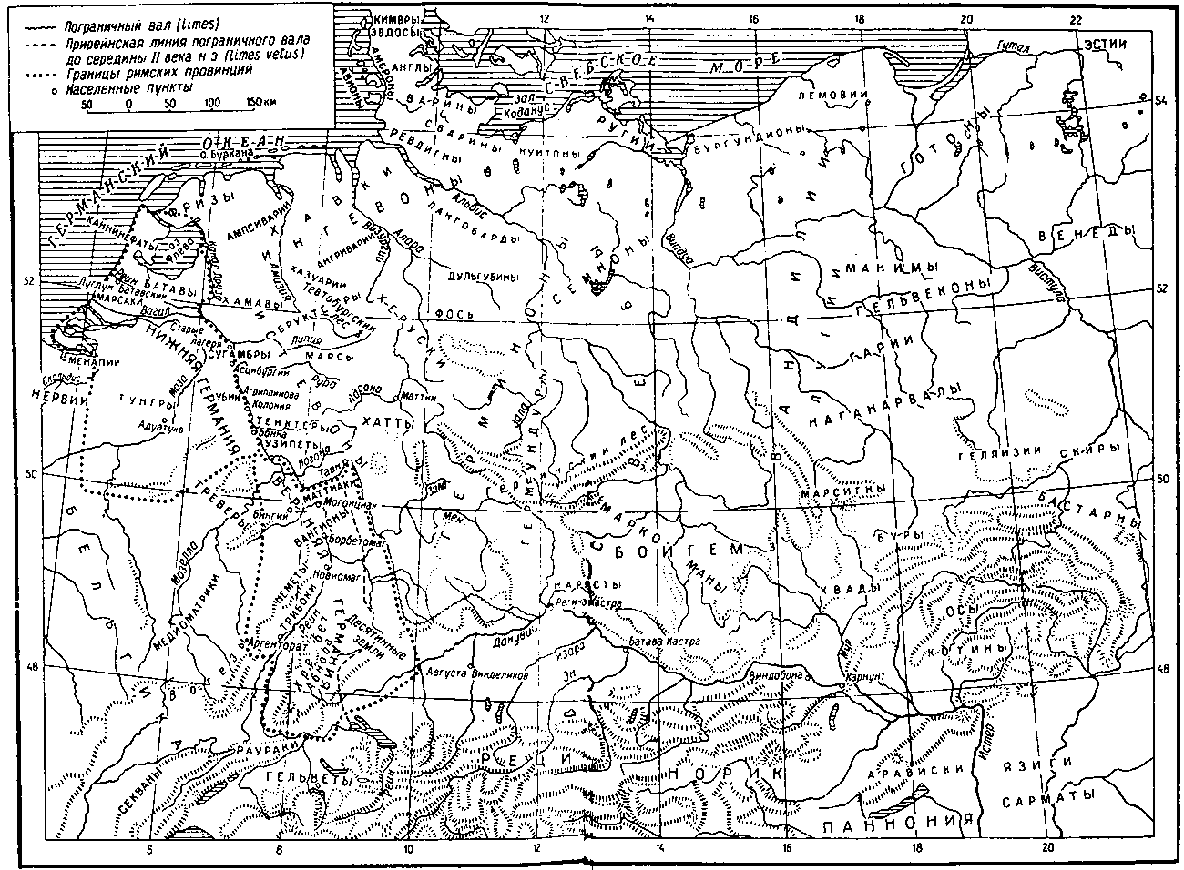 Соседнее с обаринами племя омбронов хорошо знакомо по более раннему периоду. Это родственное тевтонам и кимврам племя амбронов, принявшее участие в походе на юг в Италию в конце II в. до н. э. С одноименным племенем им пришлось встретиться в Галлии у берегов Роны. И означало оно — живущие по обеим берегам Роны [473] . После поражения, понесенного у северо-западных пределов Италии, амброны — выходцы с северного побережья Ютландии, куда-то ушли. Птолемей застал их в Прикарпатье, у истоков Вислы. Это племя появилось здесь, очевидно, позднее, чем остатки фракийских племен, а культура их, видимо, была ближе ютландским кимврам и тевтонам, чем центральноевропейским кельтским племенам боев или вольков.