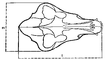 1. Наибольшую длину черепа измеряют от переднего края верхней челюсти (исключая зубы) по средней линии черепа до наиболее выступающей назад точки на затылочном гребне. Результат промеров служит баллом (рис. 6).
