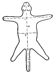 3. Делают промеры размаха передних лап от основания среднего когтя правой лапы до основания среднего когтя левой. Линия измерения должна проходить перпендикулярно к средней линии шкуры (рис. 13).