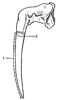 1. Длину правого и левого клыков измеряют от корня до конца острия. Результаты промеров складывают и делят на два. Средняя величина служит баллом (рис. 23).