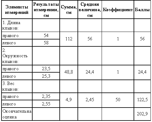 3. Определяют вес правого и левого клыков. Результаты складывают и делят на два, а среднюю величину умножают на коэффициент 50 и получают баллы (табл. 13).