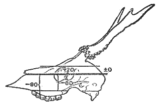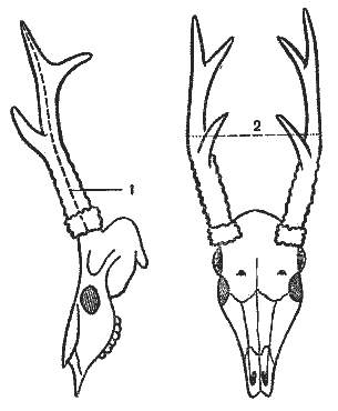 3. Вес сухих рогов определяют в граммах. Если у трофея сохранен весь череп (без нижней челюсти), то из общего веса рогов с черепом вычитают у европейской косули 90 г, а у сибирской — 110 г. Если рога отпилены с лобной костью без носовых костей, то трофею европейской косули набавляют 20 г веса, а трофею сибирской — 30 г. Если же линия отпила проходит у нижнего края носовых костей и через середину глазницы, захватывая носовые кости, то вес трофея принимается без каких-либо вычетов или набавлений (рис. 36).