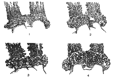7. Оценка розеток (рис. 37): слабо развитые розетки — 0 баллов; более широкие, слегка бугристые — 1 балл; с бугристыми, венцеобразными или скошенными розетками — 2 балла; с сильно бугристыми, широкими и высокими — 3 балла; с очень бугристыми, широкими и мощными розетками — 4 балла.