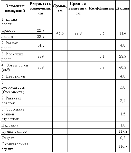 Надбавки: за хорошую длину рогов, гармоничное сочетание всех элементов трофея, красивую форму и симметричное расположение отростков комиссия экспертов присуждает до 5 баллов.