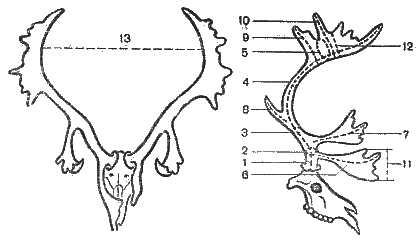 1. Длину каждого рога измеряют от нижнего края розетки по внешней боковой поверхности до конца ствола. Результаты промеров принимают за баллы. Если рога не одинаковы по длине, то разность от вычитания длины меньшего из длины большего принимается как скидка (рис. 41).