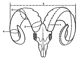 1. Длину каждого рога измеряют от нижнего края рогового чехла по передней грани до его конца, следуя спиральному изгибу. Результаты суммируют, делят на два, а полученная средняя величина служит баллом (рис. 65).
