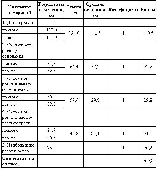 4. Окружность каждого рога измеряют в начале последней трети. Результаты складывают, делят на два, средняя величина служит баллом.