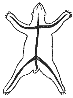 Очень важно правильно снять шкуру с убитого зверя. От этого зависят внешний вид трофея и его оценка. При снятии шкуры убитое животное укладывают на спину и, оттянув кожу на брюхе (около заднепроходного отверстия), прорезают ее острым ножом. Разрез проводят по средней линии брюха от заднепроходного отверстия до угла нижней челюсти (до подбородка), а также вдоль нижней стороны хвоста до его конца. Нож вводят под кожу острием вверх, при таком положении меньше риска прорезать мускульную стенку брюха. На передних ногах делают разрезы кожи от подошв по внутренним сторонам до груди, а на задних ногах — от подошв по внутренним сторонам до заднепроходного отверстия, обходя его разрезом спереди как можно ближе (рис. 66).