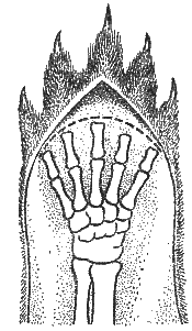 Затем отделяют кожу с задних ног до самых когтей. После этого перерезают концевые фаланги пальцев так, чтобы при шкуре остались только когти (рис. 67). Для удобства съемки шкуры мелких зверей (кошки, рысь, волк и т. п.) их подвешивают за задние ноги. С передних конечностей съемку шкуры осуществляют, как и с задних.