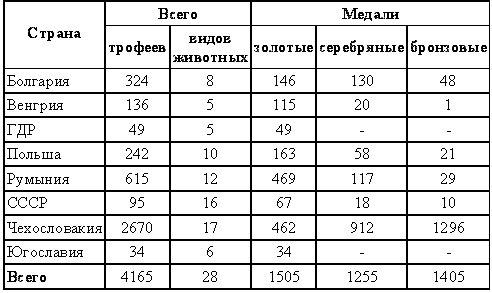 Социалистические страны получили 25 из 29 первых мест по трофеям среди европейских стран. Присуждение СССР 18 «Гран-При», 329 золотых, 158 серебряных и 47 бронзовых медалей — большая победа наших охотников.