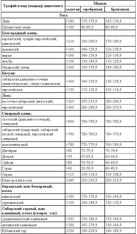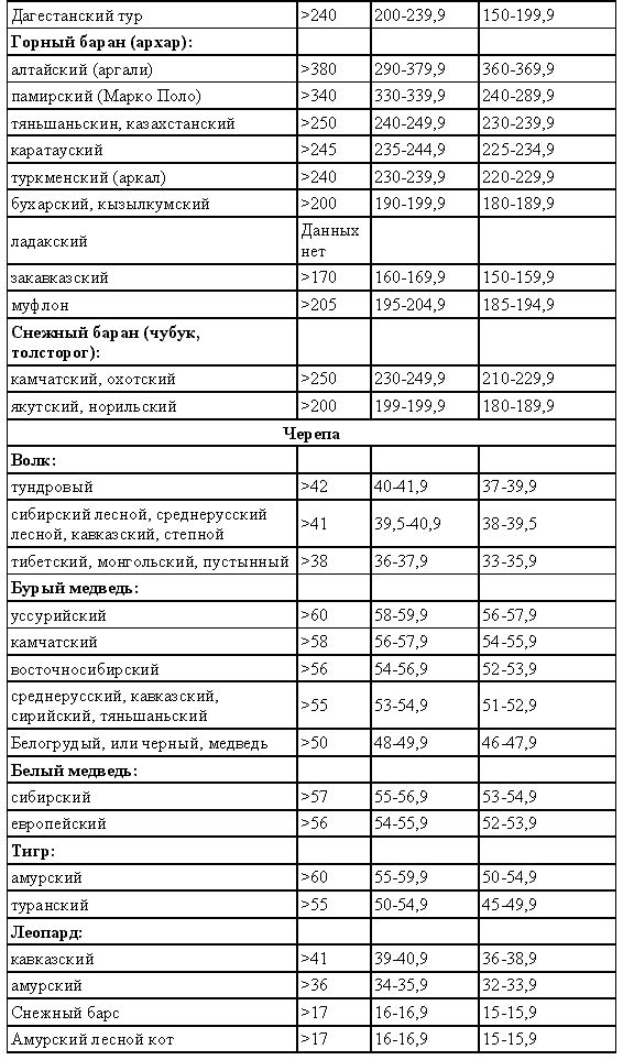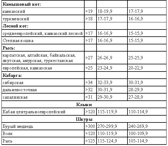Правильная оценка охотничьих трофеев на местах дает возможность владельцам принимать участие во всероссийских, всесоюзных и международных выставках охотничьих трофеев (табл. 5).