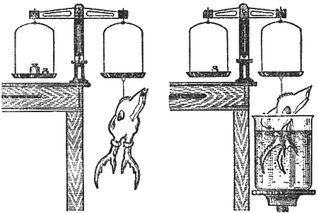 Объем рогов косули определяют следующим способом: аптечные или гидростатические весы ставят на стол так, чтобы одна чашка висела за краем стола (рис. 4). К этой чашке на тесемке или шнурке подвешивают рога и узнают их общий вес (в граммах). Затем под рогами, на специально устроенном подъемном столике, (на домкрате или на крутящемся медицинском стуле), располагают сосуд с водой (лучше всего аквариум цилиндрической формы) и рога опускают в воду до краев розеток. При этом надо снимать разновесы до тех пор, пока указатель весов не остановится на нулевой отметке. Полученный результат будет весом рогов в воде (в граммах). Из общего веса трофея (без скидок и надбавок) вычитают вес в воде — разность равна объему рогов (в см3). Для получения баллов объем умножают на коэффициент 0,3.