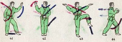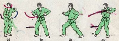 16. Левую ногу отвести назад, за правую, в стойку са-тан-мот. Вдох.