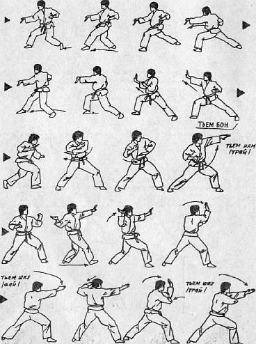 Любой кюйен представляет собой совокупность стоек и передвижений, ударов и блоков, поворотов и прыжков, выполняемых строго определенным образом, в строго определенной последовательности, по образцу, установленному раз и навсегда его создателем. Чисто внешне каждый из кюйенов напоминает одновременно и воинственный танец и замысловатый гимнастический комплекс, и какой-то ритуал. В определенном смысле так оно и есть. Это танец, вдохновляющий бойца на поединок с врагами, боевая гимнастика, развивающая двигательные качества, а также ритуальное постижение духовно-практической сущности школы.