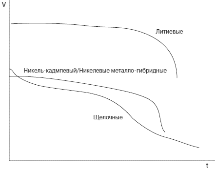 • Кадмий-никелевая: напряжение на их зажимах при полной зарядке ниже чем напряжения щелочных элементов. Также обратите внимание, что емкость батареи этого типа также значительно меньше чем у щелочных батарей. Характеристика разрядки более пологая чем у щелочных батарей, как показано на рис.6.8.