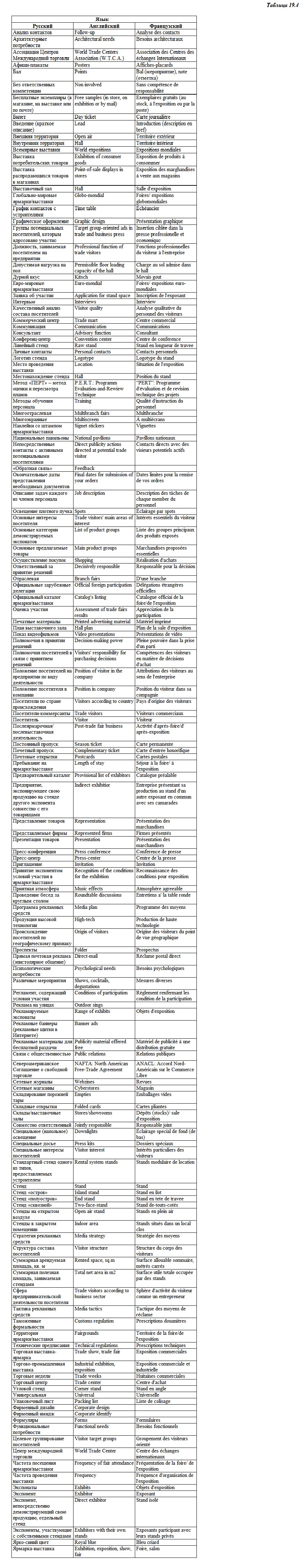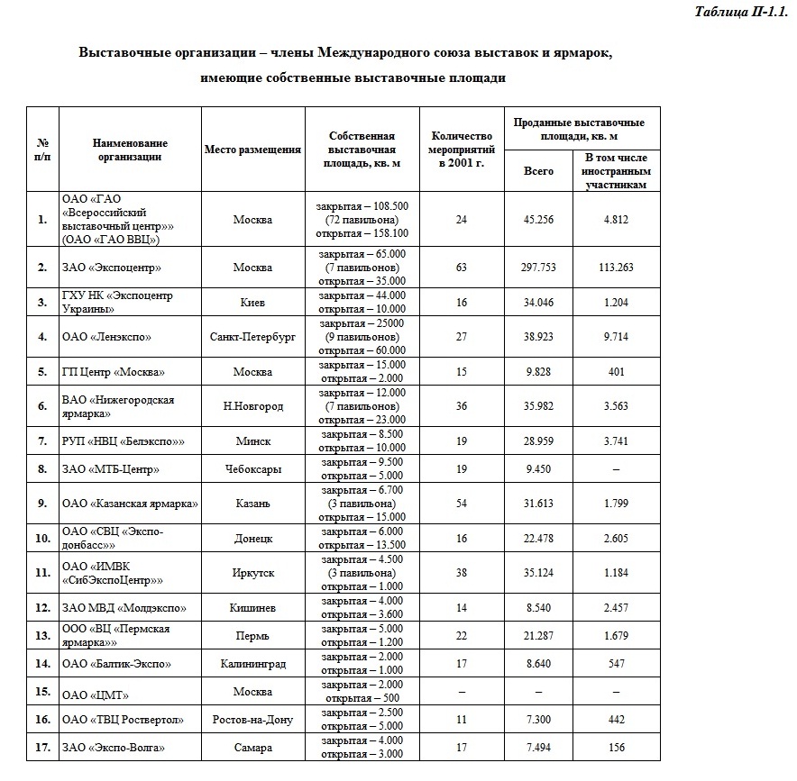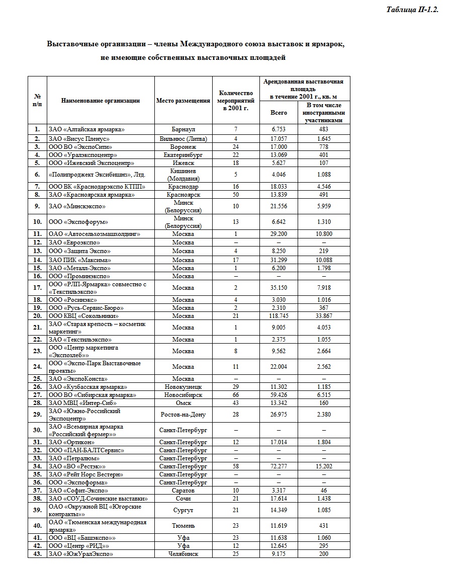 В табл. П-1.1 перечислены выставочные организации — члены Международного союза выставок и ярмарок, имеющие собственные выставочные площади, а в табл. П-1.2 — организации, не имеющие собственные выставочные площади. Ассоциированные члены МСВЯ, не имеющие собственных площадей, приведены в табл. П-1.3. В табл. П-1.4 перечислены российские выставочные организации или структуры, занимающиеся выставочной деятельностью. В табл. П-1.5 и П-1.6 приведены некоторые иностранные выставочные фирмы, сотрудничающие с российскими выставочными организациями, и иностранные фирмы, действующие на российском рынке и в некоторых странах СНГ и Балтии.