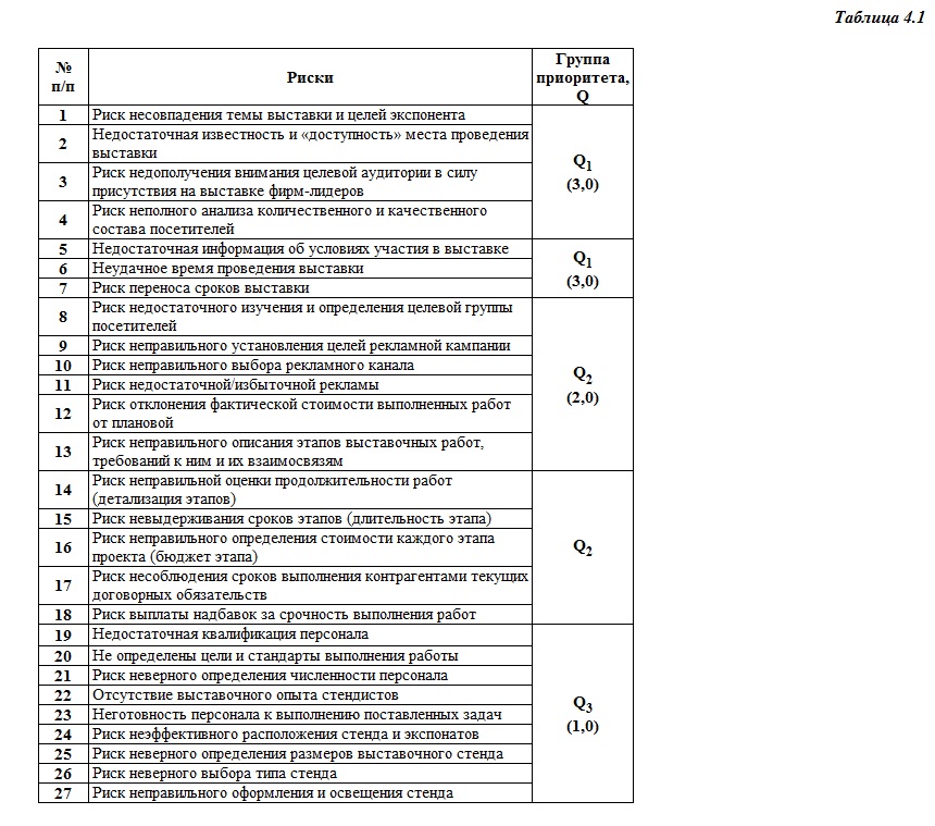 В табл. 4.2 представлены расчеты удельных весов групп риска выставочного проекта, согласно их приоритетности.