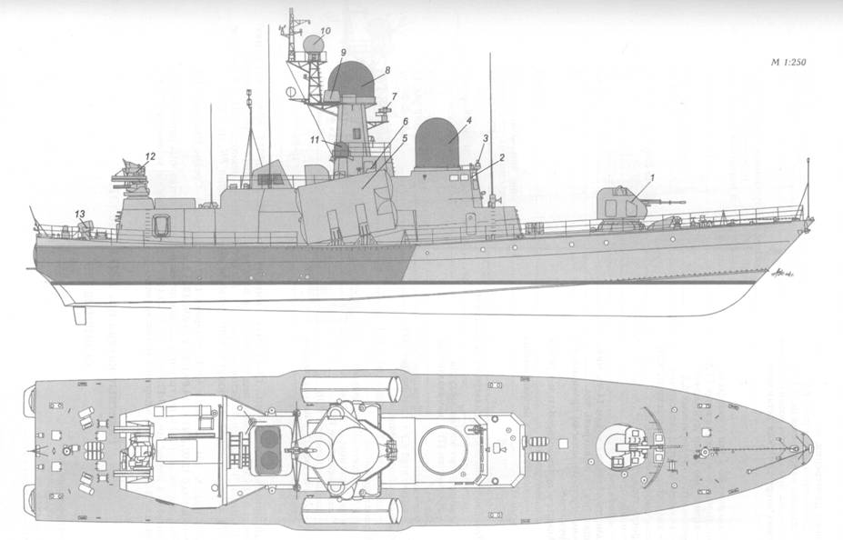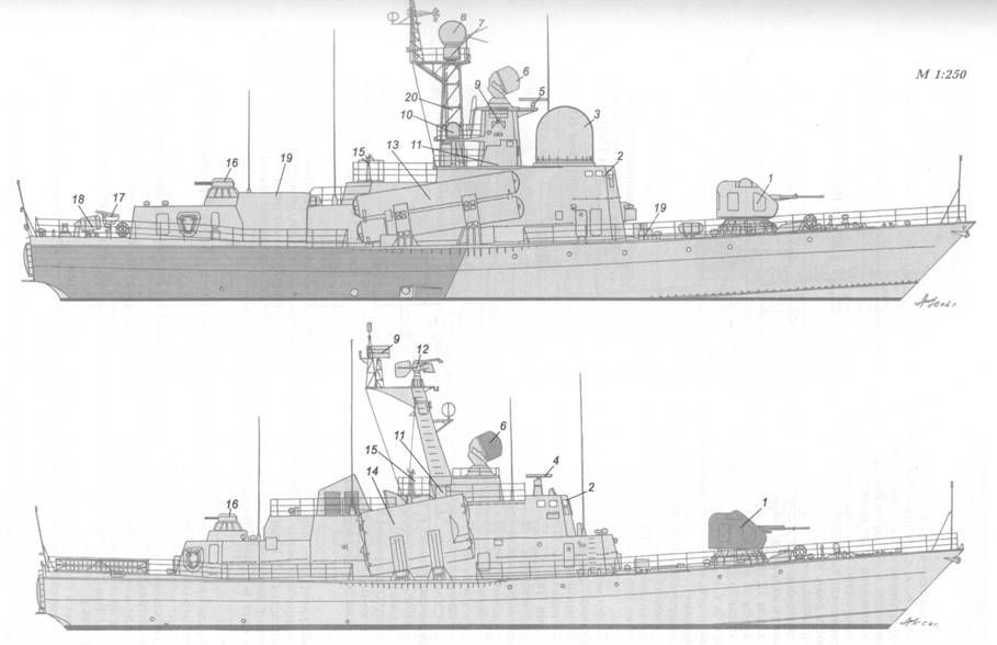 1 – 76-мм АУ АК-176; 2 – ходовая рубка; 3 – основной (комплексный) All РЛК «Монолит»; 4 – АП РЛС «Кивач-2»; 5 – АП РЛС «Печера»; 6 – АП РЛС СУАО «Вымпел»; 7 – АП станции РТР комплекса средств РЭБ «Вымпел-Р2»; 8 – АП канала приема целеуказания (УСБД) РЛК «Монолит»; 9 – АП станции «Пароль-3» (системы опознавания); 10 – АП станции постановки активных помех комплекса средств РЭБ «Вымпел-Р2»; 1 1 – ходовой мостик; 12 – АП РЛС «Гарпун»; 13 – ТПК КТ-152 ПКРК «Москит»; 14 – ТПК ГЖРК П-15М («Термит»); 15 – визирная колонка СУАО «Вымпел»; 16 – 30-мм АУ АК-630М; 17 – ПУ (упор) ПЗРК «Стрела-3»; 18 – ПУ ПК-16 НУРС СППП; 19 – фундаменты под ПУ ПК-10 НУРС СППП (всего на кораблях пр. 12411 предусмотрены места для размещения четырех таких ПУ); 20 – фундаменты под датчики оповещения о лазерном излучении системы «Спектр-Ф» (устанавливается в процессе среднего ремонта кораблей).