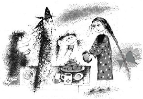 В это самое время одна ступенька на крыльце пискнула мышкой, другая мяукнула кошкой, третья вздохнула медведем. И за столом — никого, и посуда вся убрана.