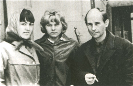 На могиле отца. Осень 1962 года. Слева от Н. Рубцова — Софья Андриановна Рубцова, крайняя справа — мачеха Женя