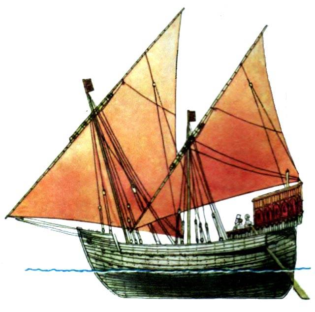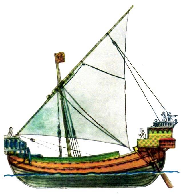 На вкладке – торговое венецианское судно XIV века: две мачты с «латинскими» парусами, две палубы, две надстройки, один люк и вырез в борту для погрузки товаров непосредственно на твиндек – межпалубное пространство. Вместо навесного руля – два рулевых весла. Длина ' подобных судов – иногда их называют нефами и гаттами – достигала 30 м, ширина – 8 м, высота мачты – 25 м. Именно такой корабль описан Шекспиром в «Венецианском купце».