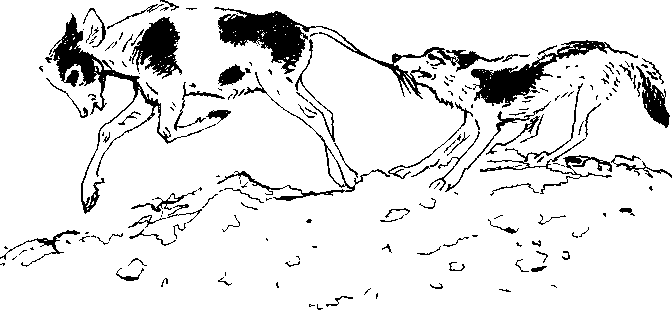 Корова и тёлка кинулись к дому, выпучив глаза от ужаса и задрав хвосты. Тёлка оказалась ниже волка по склону. Второй прыжок – и зверь мёртвой хваткой вцепился в кончик хвоста обезумевшей жертвы. Упираясь всеми четырьмя лапами, Волчок тормозил, не выпуская хвоста. Но сильная тёлка тащила его за собой, сразу отстав от коровы. Неожиданно челюсти волка разжались, и тёлка потеряла равновесие – её зад подбросило вверх, животное упало на колени, сильно ударившись мордой о камни. Тяжёлый, огромный волк придавил тёлку к земле и вцепился ей в горло. Но... годы сделали своё дело: зубы старого волка были совсем тупые. Он только слегка поцарапал шкуру на шее тёлки. Молодое сильное животное вскочило на ноги, сбросило волка и как бешеное унеслось на кордон, высоко задрав хвост.