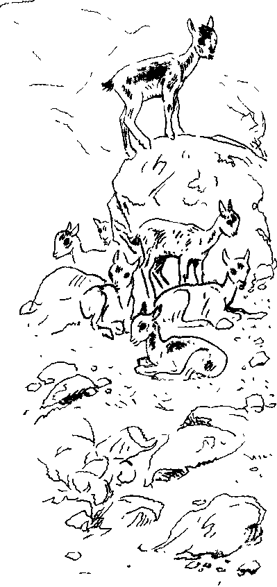 Наконец егерь увидел их. Большой табунок течат медленно поднимался по склону. Их было несколько десятков. И с ними действительно не было ни одного взрослого животного! Течата были совсем ещё крохотные – родились этой весной. На ходу они играли, как дети. Два козлёнка вскочили на дыбы, с размаху стукнулись лбами, а потом как ни в чём не бывало побежали рядышком догонять остальных. А вот один козлёнок вскочил на камень и стал тревожно осматриваться, поводя ушами, совсем как взрослый козёл. Вдруг удар – это другой козлёнок сшиб его с камня, а сам вскочил на его место. Но не прошло и минуты, как его сбросил с камня ещё один козлёнок. А два козлёнка долго гонялись по склону друг за другом – то один козлёнок догонял другого, то наоборот. Но основная масса маленьких течат деловито шагала в гору.