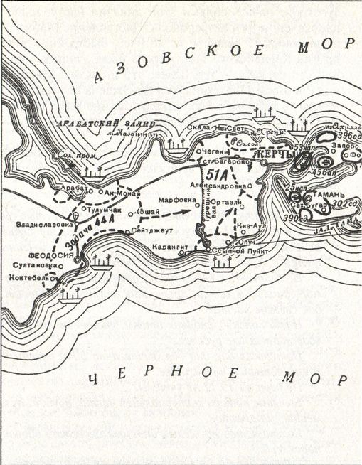 Второй директивой № 01825/011 армиям подтверждались прежние задачи. [67] Десант Азовской флотилии, ранее предназначавшийся для захвата Арабатской стрелки, должен был высадиться в районе Чегени. Командующему 44-й армией приказывалось, дополнительно выбросить парашютный десант силой в одну роту — но не у Владиславовки, как предполагалось ранее, а в районе станции Багерово.