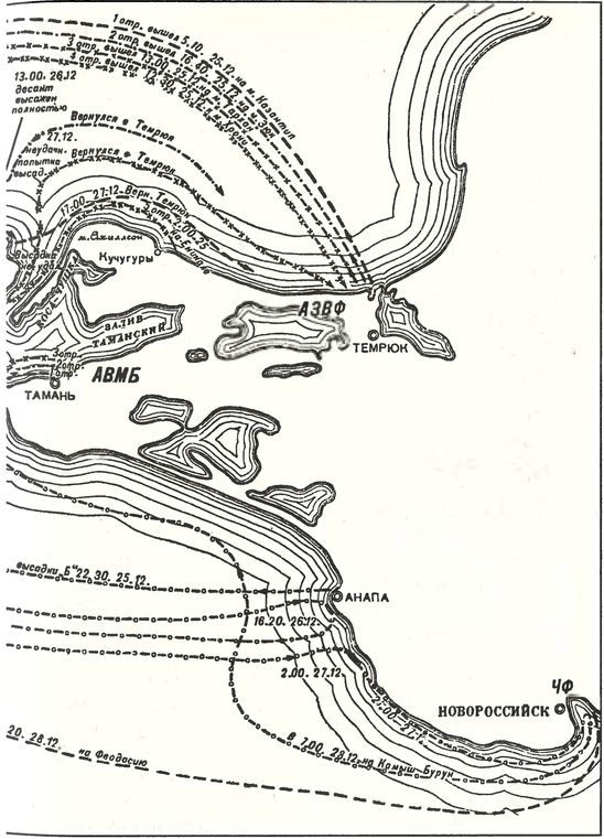Приказание на высадку десанта было получено командованием базы 24 декабря, высадку требовалось провести в ночь на 26 декабря. К рассвету 25 декабря суда были сосредоточены в заранее намеченных пунктах посадки Тамань и Комсомольск. Несмотря на тренировки и заранее разработанные плановые таблицы, посадка проходила медленно и неорганизованно. В назначенное время (к часу ночи) ее закончил только 1-й отряд (отряд первого броска). 2-й отряд опоздал с выходом на час, 3-й — на два часа. По дороге строй из-за шторма разбился, сейнеры шли самостоятельно.