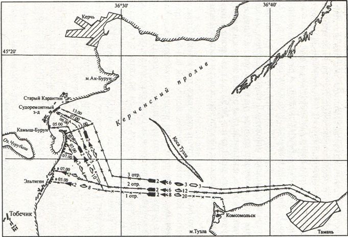 Для перехода отрядов был выбран путь через мелководную Тузлинскую промоину, поскольку пролив западнее острова Тузла просматривался и простреливался противником. Однако часть ограждений и сигналов, установленных здесь 18–20 декабря, в результате шторма оказалась сорвана и вновь установлена только 28 декабря. В результате баржи 3-го отряда сели на мель, их снятие затянулось до 11 часов 26 декабря.