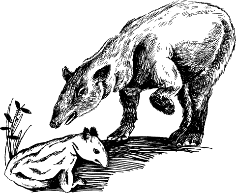 Тапиры — родичи лошадей и носорогов. И в наши дни очень похожи они на древних прародителей своих и лошадиных. Верхняя губа и нос тапира вытянуты в небольшой хоботок, который уныло висит вниз. Но когда возбужден тапир, нос его, напрягаясь, гибкой трубкой изгибается во все стороны, с храпом и сопением вынюхивая возможных недругов и выискивая безопасное направление, куда близорукий, но с острым чутьем зверь тут же кинется, сокрушая растительные преграды.