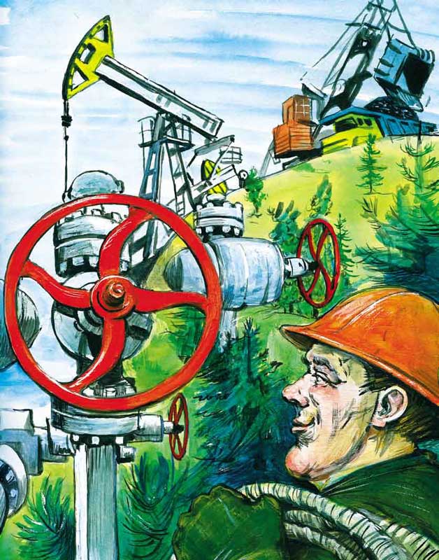 Тайга — настоящая кладовая всевозможных полезных ископаемых. Всё тут есть — и золото, и никель, и медь, и алмазы, и драгоценные самоцветы. Но самое главное богатство, которое накопила в своих подземных кладовых тайга, — это гигантские месторождения нефти и газа, лежащие в глубине сибирских болот. Теперь над таёжным простором взметнулись в небо тысячи буровых вышек, с помощью которых люди добывают это подземное сокровище. Нефть и газ очень нужны людям. Газ отапливает наши дома, а из нефти делают бензин, пластмассу, парафин для свечек, лекарства и ещё много-много других нужных вещей.