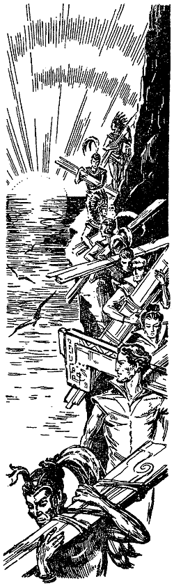 Мы, сыны Солнца, разделяли тяготы наших друзей. Каждый из нас нес что-нибудь из частей корабля. Нам с Эрой достался рулевой механизм. К концу дня он, казалось, весил вдвое больше, чем с утра.