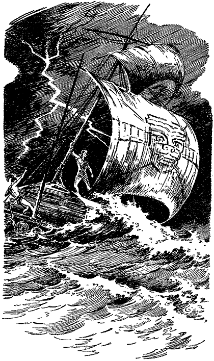 Мы чувствовали, что плывем теперь не по океану, как на корабле, а в самом океане. Вода была не только под нами, не только рядом, она была вокруг нас и даже над нами, то и дело перекрывая плот полупрозрачным зеленым сводом. Вот тогда пригодилась нам тренировка в беге без дыхания. Мы умудрились остаться в живых, находясь подолгу под водой, споря с исконно морскими животными. Впрочем, Чичкалан и инки тоже перенесли такое испытание, хотя и чувствовали себя несравненно хуже нас.