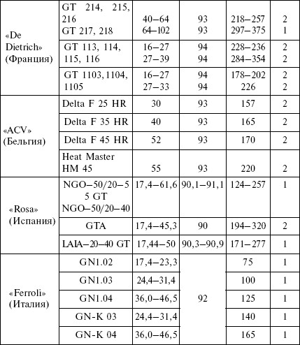 Комбинированные котлы, как правило, работают на принципе использования нескольких источников тепла. Обычно применяются газ и дизельное топливо. В табл. 21 даны технические характеристики некоторых моделей комбинированных котлов. Естественно, что цена такого рода водогрейных котлов значительно выше однотопливных. Несмотря на то что КПД работы комбинированных агрегатов ниже на 15—20%, чем у однотопливных, они более надежны и долговечны. При возникновении перебоев в подаче газа можно легко перевести котел на другой вид топлива, что, конечно, также является одним из положительных качеств.
