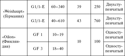 Если агрегат имеет одну комбинированную горелку, то подводящие топливные линии (газ и жидкое топливо) подходят к ней с двух сторон. При необходимости горелка подключается к нужной линии. Конструктивная особенность комбинированных горелок состоит в том, что они имеют одинаково круглое пламя независимо от вида топлива. Обычно такие горелки оснащены воздушным клапаном на сервоприводе, что позволяет значительно экономить тепло и дает возможность топливу сгорать полностью. Данный клапан не дает камере сгорания остывать в период, когда котел не работает, а при вторичном розжиге аппарата плавно переводит оборудование в рабочее состояние. Есть или нет в горелке воздушный клапан, можно увидеть в маркировке. В табл. 22 даны некоторые модели газовых горелок для комбинированных котлов, а в табл. 23 – модели жидкотопливных горелок.