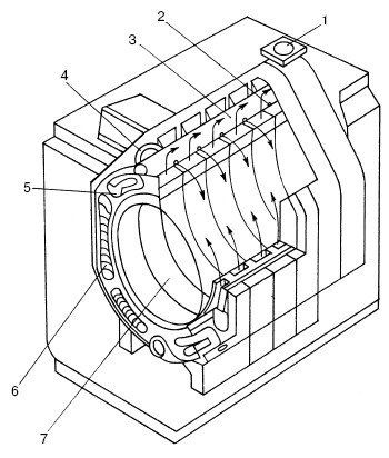 Рис. 23. Газовый котел «Logano GE-515»: 1 – подающая линия котла; 2 – отверстия выхода воды; 3 – обратная линия котла; 4 – верхняя обечайка; 5 – второй ход продуктов сгорания; 6 – третий ход продуктов сгорания; 7 – топка (первый ход продуктов сгорания)