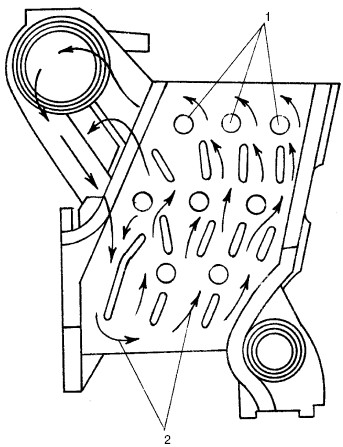 Рис. 24. Водяной контур чугунной секции котла «Logano GE-434»: 1 – трубки подачи холодной воды; 2 – потоки теплой воды