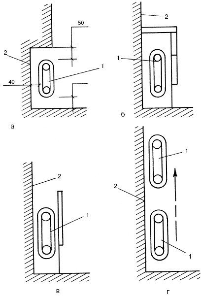 Рис. 28. Варианты размещения отопительных приборов: а – в нише стены; б – в специальном укрытии; в – за щитом; г – в два яруса (один над другим); 1 – отопительный прибор; 2 – стена