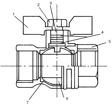 Рис. 54. Шаровой кран: 1 – ручка; 2 – гайка, фиксирующая ручку на штоке; 3 – шток; 4 – уплотнительные кольца; 5 – корпус клапана; 6 – шаровой затвор; 7 – уплотнительные тефлоновые кольца