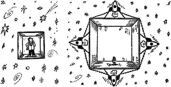 Вообразим себе обыкновенную прямоугольную комнату, расположенную где-то во Вселенной далеко от небесных тел. В комнате нет никаких предметов, частиц, полей. Теперь сделаем умственное усилие и допустим, что стены комнаты, ее потолок и пол вдруг стали раздвигаться, пока не убежали в бесконечность. В такой-то «комнате» и вершатся явления природы в соответствии с законами классической механики. Пространство этой «комнаты» неподвижно, пребывает в абсолютном покое.