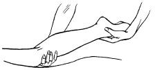 Дойдя до верхней части бедра, одну руку направляют к его внутренней стороне, а другой рукой делают круговые движения по бедру. Затем обе руки медленно передвигают вниз по боковым сторонам к стопе. Прием следует повторить еще раз. Следующий прием – вытягивание ноги. Вытягивание нужно выполнить следующим образом: одной рукой взять пятку, другой – внешнюю поверхность стопы, затем податься назад так, чтобы руки были полностью вытянуты, приподнять стопу на несколько сантиметров и тянуть, слегка потряхивая ногу. Потом следует не спеша опустить ногу и повторить вытягивание. При вытягивании растяжению подвергаются три сустава: тазобедренный, коленный и голеностопный.